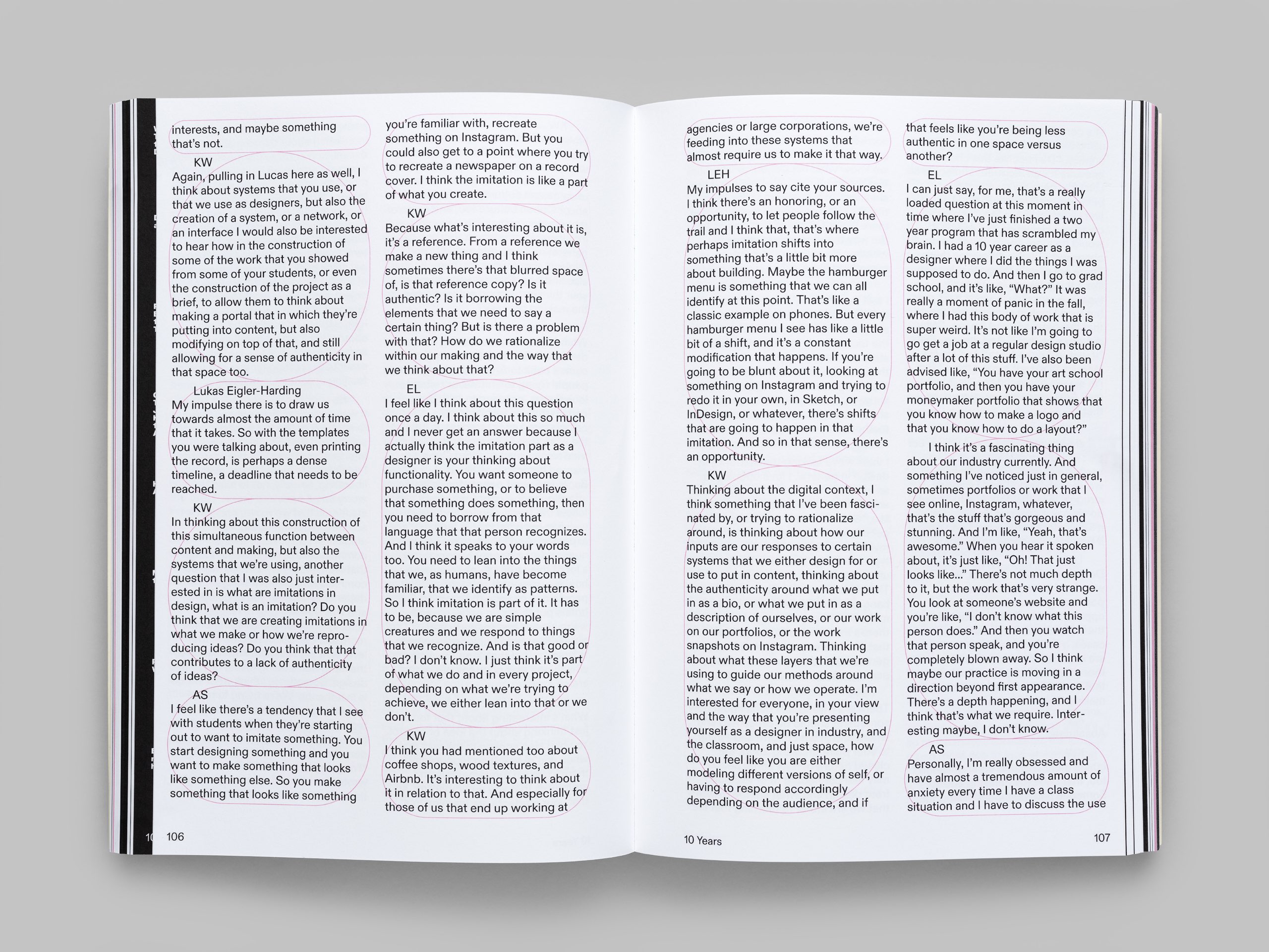 1, 10, 100 Years of Form, Typography, and Interaction at Parsons catalogs the history of design education at Parsons. It is built on a carefully selected set of lightweight, interconnected technologies, proposing an alternative to the current monolithic software tools for designing books. (With E Roon Kang as 908A)